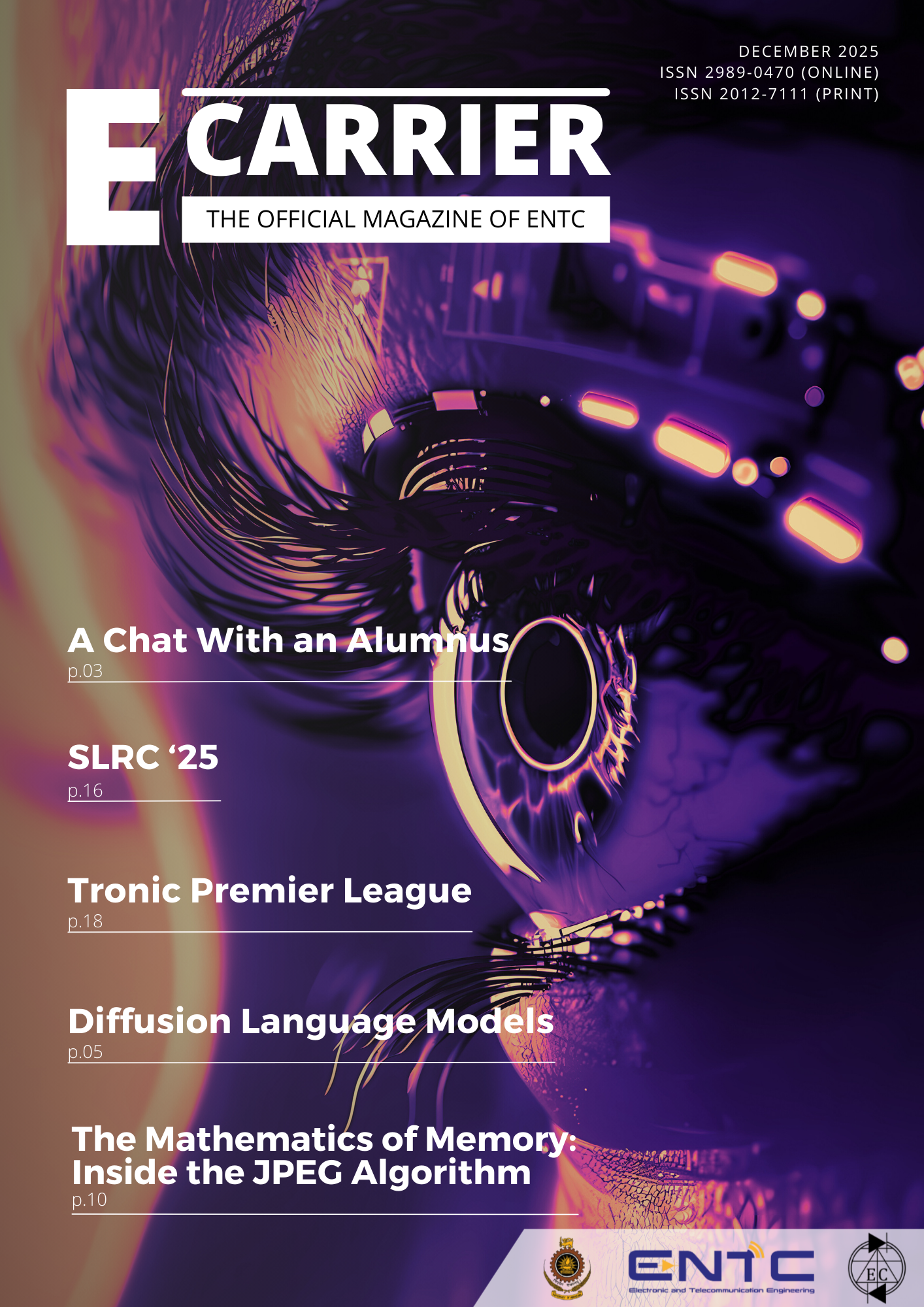 The E-Carrier magazine of the Department of Electronic and Telecommunication (ENTC) aims to maintain a constant and consistent flow of news updates from the Department of ENTC to students, department alumni, and industry to establish a persistent communication medium. This tri-annual magazine focuses on the latest information on trending and advanced technologies and news on events and developments taking place within the department. All members of the academic staff of the department, students, and alumni are invited to submit articles for publication in the magazine.